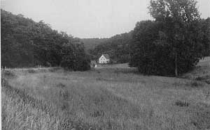 Auf dem Hauptweg geht es dann weiter am Goldberg ( links ) - der übrigens für viele Jahre ein beliebter Einstand für Fasanen war - und dem Hau ( bereits genanntes Waldstück auf der rechten Seite hinter Bach, Wiese und Feld ) vorbei zu den nächsten Mühlen. Vor diesem Ziel führt an der linken Seite ein schmaler Weg ab, an dem der mögliche Standort der bereits erwähnten Leinenweberei gewesen sein muß oder der zu dieser hinführte.
